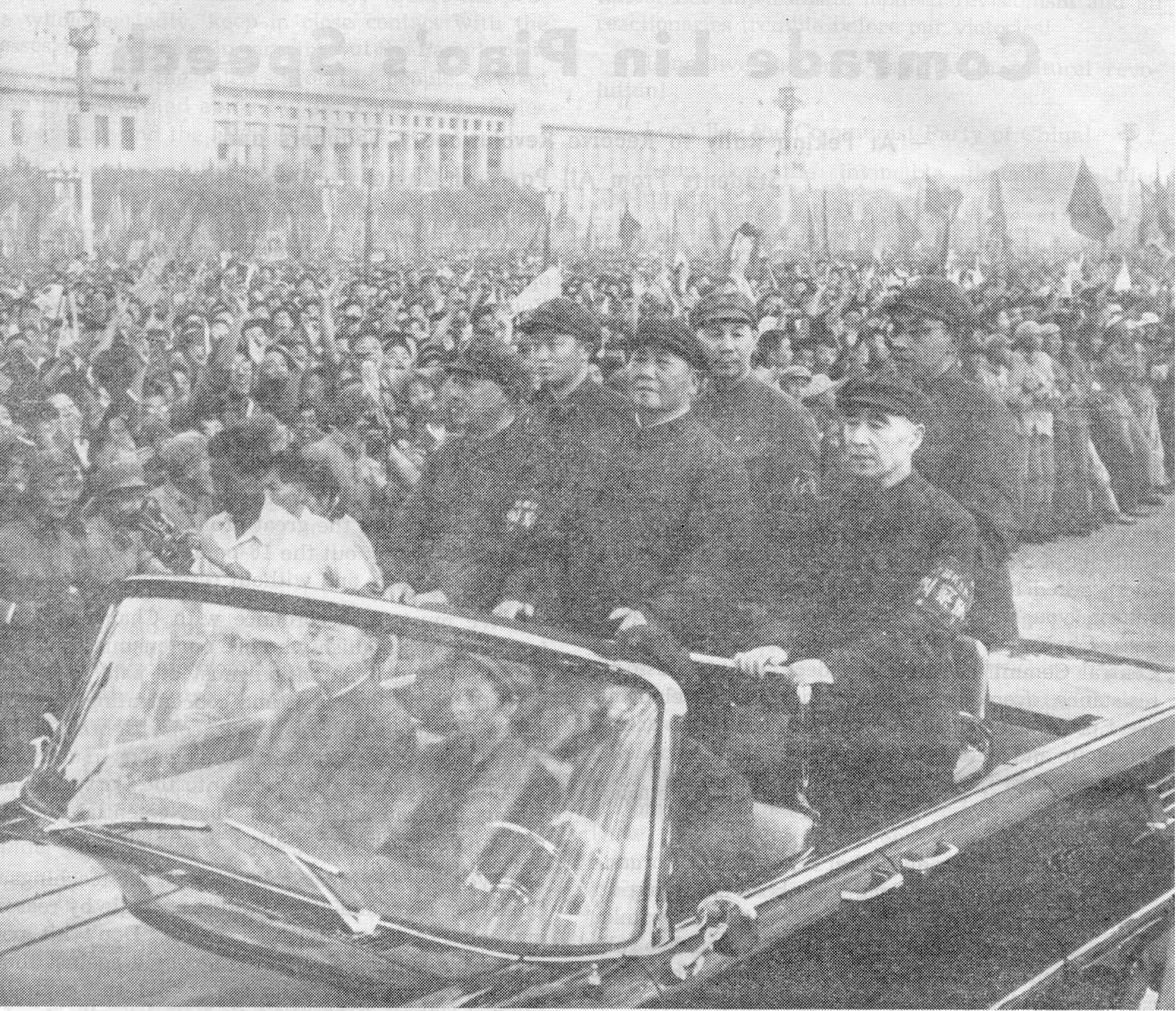 At 5:40 in the afternoon, our most respected and beloved leader Chairman Mao, his close comrade-in-arms Comrade Lin Piao, and Comrade Ho Lung arrived in an open car at the Tien An Men Square and drove slowly into the midst of the masses of Red Guards and revolutionary teachers and students. They were accompanied by Comrades Hsieh Fu-chih and Yang Cheng-wu. A mighty, jubilant wave of cheers rose up from the square. Everyone turned to Chairman Mao; people cheered and jumped in their excitement. As Chairman Mao’s car drove slowly around the square, thousands of pairs of eyes filled with deep feelings were turned on him; thousands of revolutionary red hearts turned to the red sun. Cheers of “Long live Chairman Mao” and “Long live, long live Chairman Mao” shook the skies.
