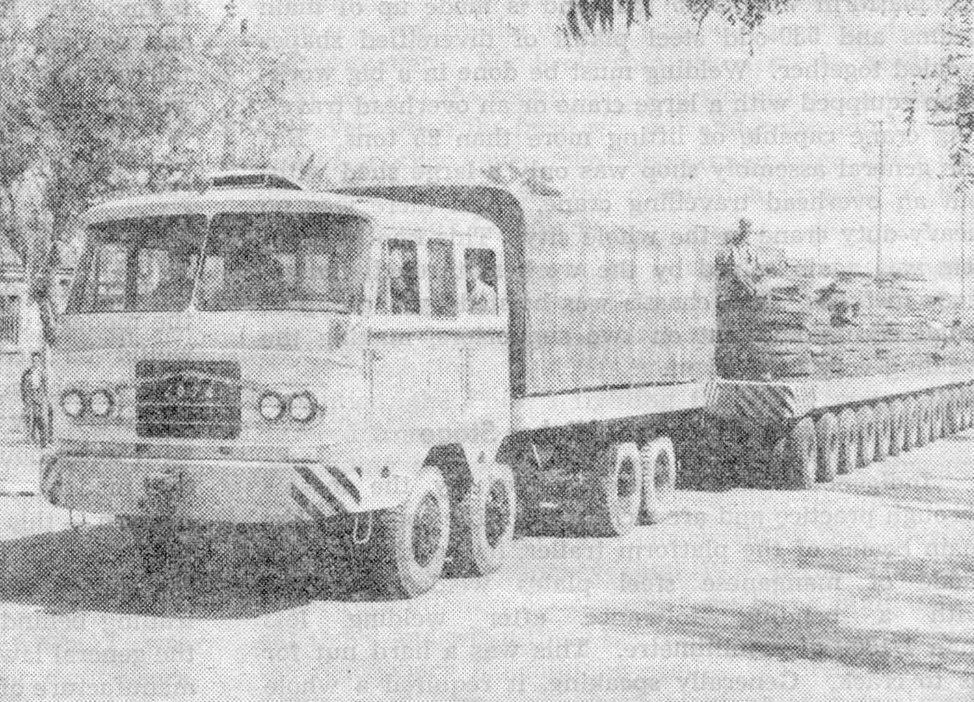 UNDER the impetus of the movement to criticize Lin Piao and Confucius and supported by other factories in various parts of China, workers of Tsangchow city (in the southern part of Hopei Province) self-designed and manufactured China’s first large 400-ton platform trailer. This heavy-duty trailer and its 500 h.p. truck tractor together weigh 136 tons, measure 33 metres long, 3.8 metres wide and 3.45 metres high, and have a total of 116 wheels. After a series of loaded and unloaded text runs, it has proved to be functioning well and its capacity is up to the required standard. The new vehicle is now in use, after examination and final approval by departments concerned.