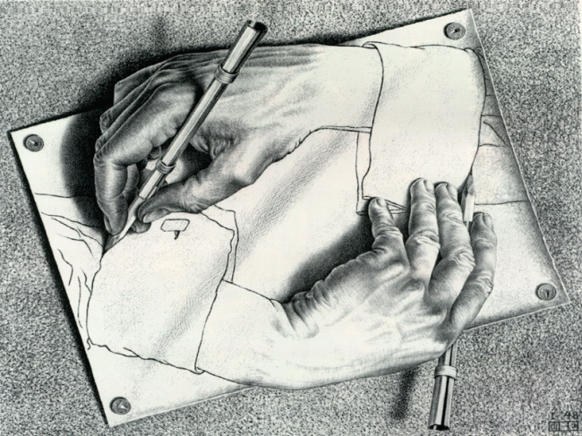 and the comments on them that Hofstadter made, such as in discussing Escher’s drawing “Hands