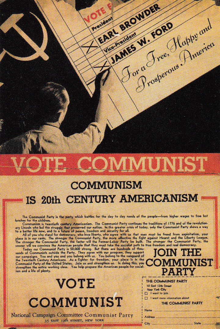 “[Browder] argued that the Declaration of Independence foreshadowed the Communist Manifesto and extolled Jefferson and Lincoln as exemplars of American radicalism. The party played ‘Yankee Doodle’ at its meetings, decked its platforms in the Stars and Stripes, and adopted the slogan: ‘Communism is 20th-Century Americanism.’” —From a book review by the bourgeois writer Michael J. Ybarra, Washington Monthly, July-August, 1997.