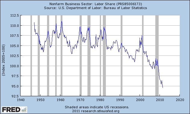 The chart at the above right (from the St. Louis branch of the Federal Reserve) shows an index value comparing the share of national income received by labor from year to year (with 2005 being arbitrarily set to 100). As is evident, labor’s share of income is sinking like a rock, and is now at historic lows.