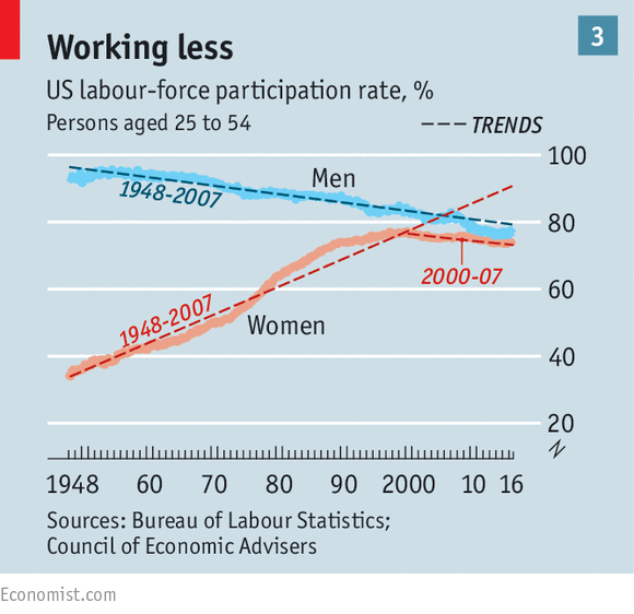 In this graph, accompanying an article by President Obama in the Economist [Oct. 8, 2016, p. 24], we see the changing U.S. labor force participation rate over a longer period (1948-2016) and separated out by sex. Several facts should be noted: First, in the post-World War II period more and more women got jobs. Until the early 1970s this had the effect of increasing the average family income and promoted the growth of the so-called