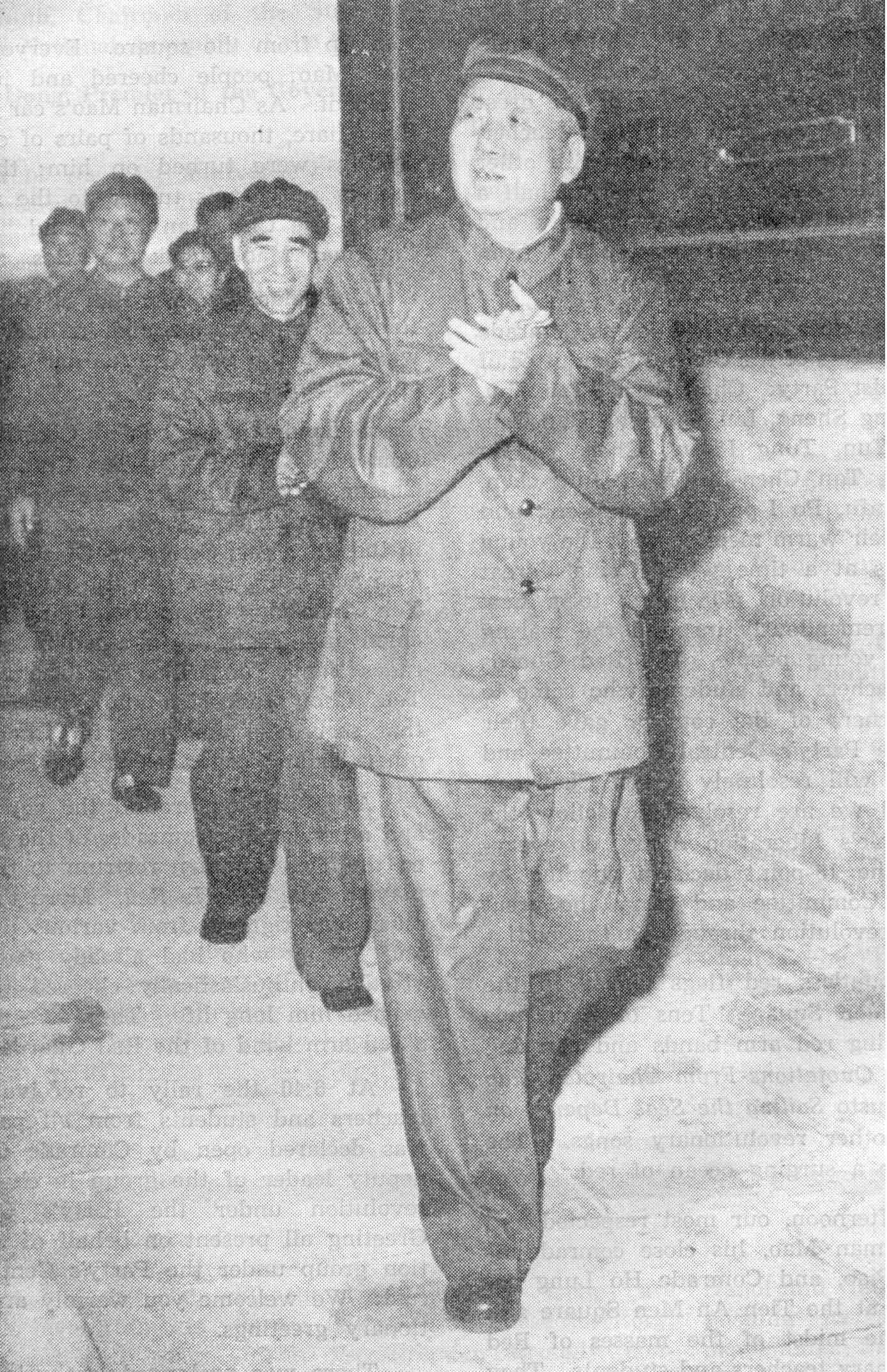 Chairman Mao wore an olive-green army uniform. Radiant with vigour and in buoyant spirits, he kept waving to the Red Guards and revolutionary teachers and students.