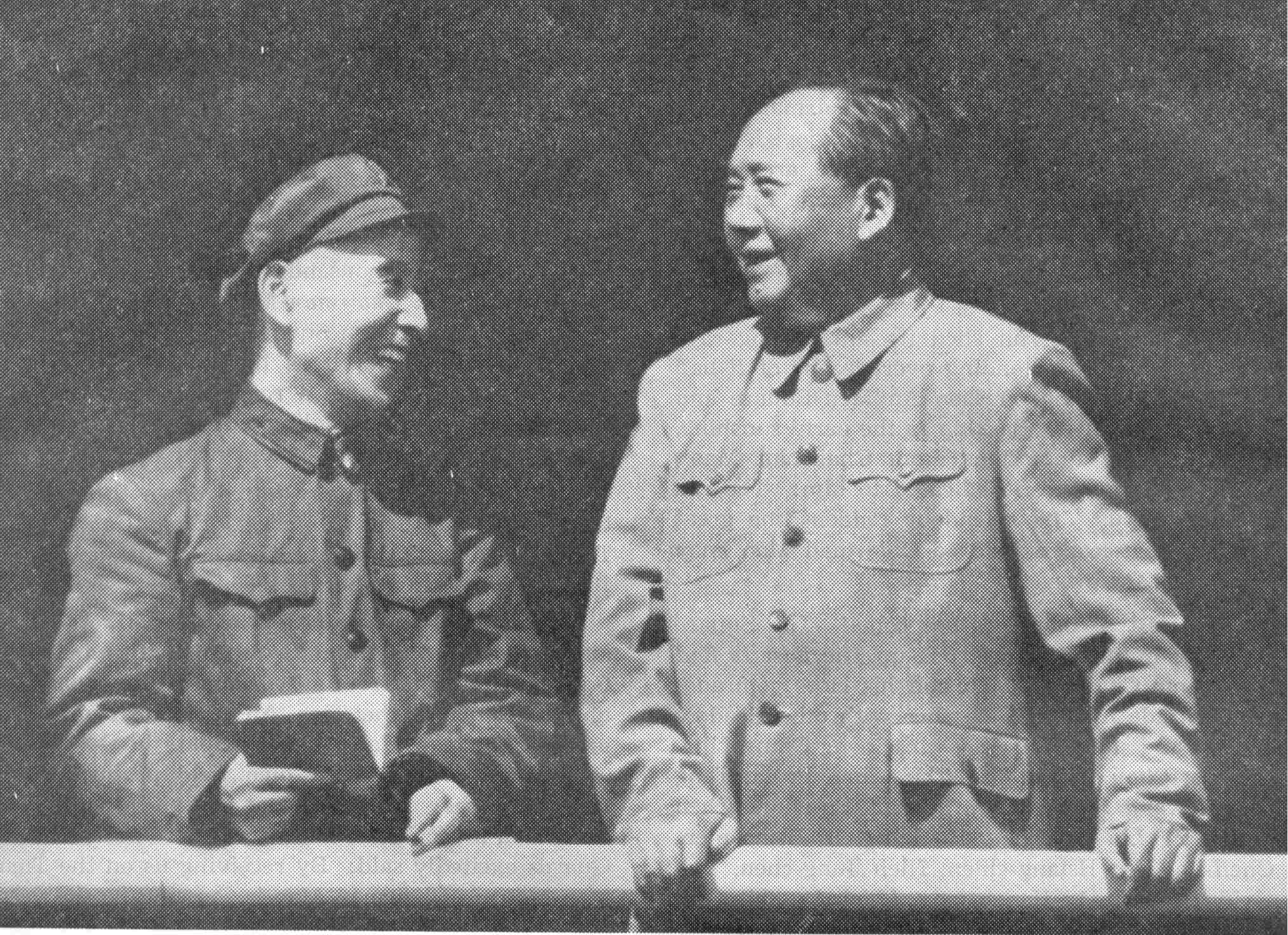 The happiest of moments has come! The Square was astir, the military band struck up The East Is Red and then came Chairman Mao and his close comrade-in-arms Comrade Lin Piao, together with other leaders of the Party and state: Liu Shao-chi, Soong Ching Ling, Tung Pi-wu, Chou En-lai, Tao Chu, Chen Po-ta, Teng Hsiao-ping, Kang Sheng, Chu Teh, Li Fu-chun, Chen Yun, Chen Yi, Liu Po-cheng, Ho Lung, Li Hsien-nien, Tan Chen-lin, Hsu Hsiang-chien, Nieh Jung-chen, Yeh Chien-ying, Ulanfu, Li Hsueh-feng, Hsieh Fu-chih, Liu Ning-I, Hsiao Hua, Yang Cheng-wu and Chiang Ching. They mounted the Tien An Men rostrum.