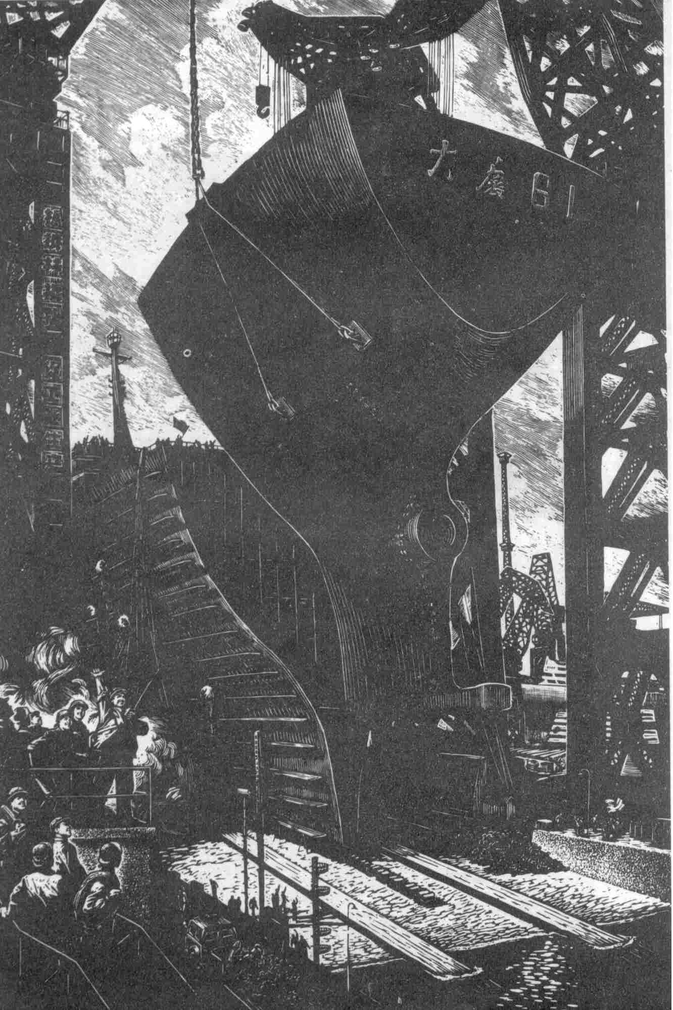 In line with the policy of “maintaining independence and keeping the initiative in our own hands and relying on our own efforts,” our shipbuilders made a 24,000-ton tanker. In the course of construction, the workers had to hoist the ship’s 156-ton stern from the ground, turn it upside down in mid-air and then attach it to the hull. There was no heavy-duty crane on hand to lift such a weight. After repeated trials, they succeeded in using three small cranes simultaneously instead of a big one. The woodcut Lifting the Huge appearing in this issue was done by an electric welder in the shipyard. Deeply impressed by the workers’ initiatives this amateur translated that moving scene and the workers’ revolutionary spirit into a work of art. He took his draft to the dock and solicited the workers’ opinions and he also asked professional artists for help. Revised again and again, the woodcut was put up in the shipyard’s picture booth before the vessel was launched.