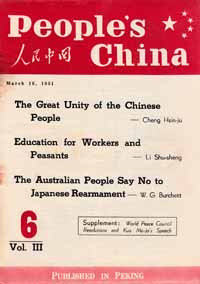 This magazine, published twice each month, was launched in English in January 1950. It also soon had editions in Russian, Japanese, Chinese, French and Indonesian. We are not entirely sure when the English language edition was terminated, but it continued at least through 1957. We believe its function was then replaced by the weekly news magazine Peking Review (which began publishing in March 1958) and the monthly feature magazine China Reconstructs (begun in January 1952). In later years only the Japanese edition of People’s China continued to be published.